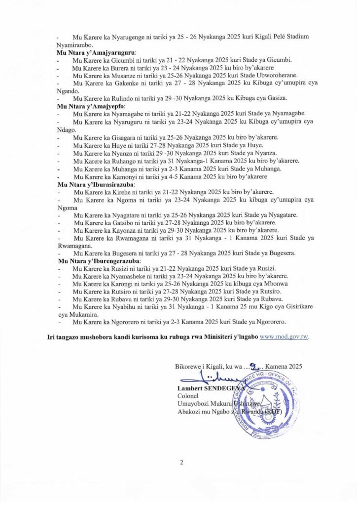 Ubuyobozi bukuru bw’ingabo z’u Rwanda (RDF) bwatangaje itangazo rigenewe Abanyarwanda bose bifuza kwinjira mu Ngabo z’u Rwanda, haba mu rwego rw’abasirikare bato cyangwa mu rwego rw’Ingabo z’inkeragutabara (Reserve Force). Kwiyandikisha bizatangira ku itariki ya 21 Kamena kugeza ku ya 20 Nyakanga 2025.Abasaba kwinjira mu Ngabo zisanzwe bagomba kuba bujuje ibisabwa birimo kuba ari Abanyarwanda, bafite imyaka 18-25, bararangije amashuri nibura S3, bafite ubuzima buzira umuze kandi batarigeze bakurikiranwa n’inkiko
