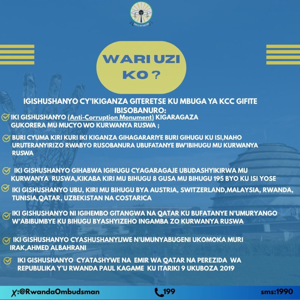Ku mbuga yegereye inyubako izwi cyane ya Kigali Convention Centre (KCC) hubatswe igishushanyo gikomeye kidasanzwe n’ikiganza kinini gikoze mu byuma kizwi ku izina rya “Anti-Corruption Monument”. iki gishushanyo nticyashyizweho gusa nk’ikirango cy’umutako ahubwo ni ikimenyetso gikomeye cy’ubwitange n’ubufatanye bw’isi mu guhangana na ruswa.iki kiganza cyubatswe ku bufatanye n’igihugu cya Qatar gihabwa gusa ibihugu byagaragaje ubushake buhambaye bwo kurwanya ruswa kikaba kimaze gushyirwa mu bihugu 8 gusa mu bihugu 195 bigize isi yose. U Rwanda ni kimwe muri ibyo bihugu by’icyitegererezo mu guhashya ruswa, kimwe na Austria, Switzerland, Malaysia, Tunisia, Uzbekistan, Costa Rica, na Qatar.