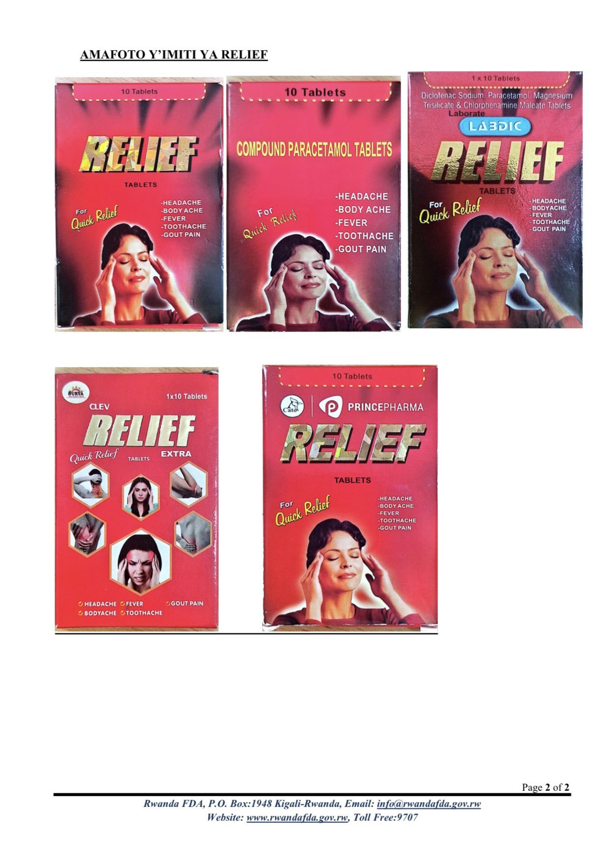 Tariki ya 11 Kamena 2025 ikigo cy’igihugu gishinzwe Kugenzura ibiribwa n’imiti (Rwanda FDA) cyatangaje ko cyahagaritse by’agateganyo itumizwa, ikwirakwizwa n’ikoreshwa ry’imiti yose y’ibinini yitwa RELIEF, kugeza igihe hazafatirwa ikindi cyemezo.