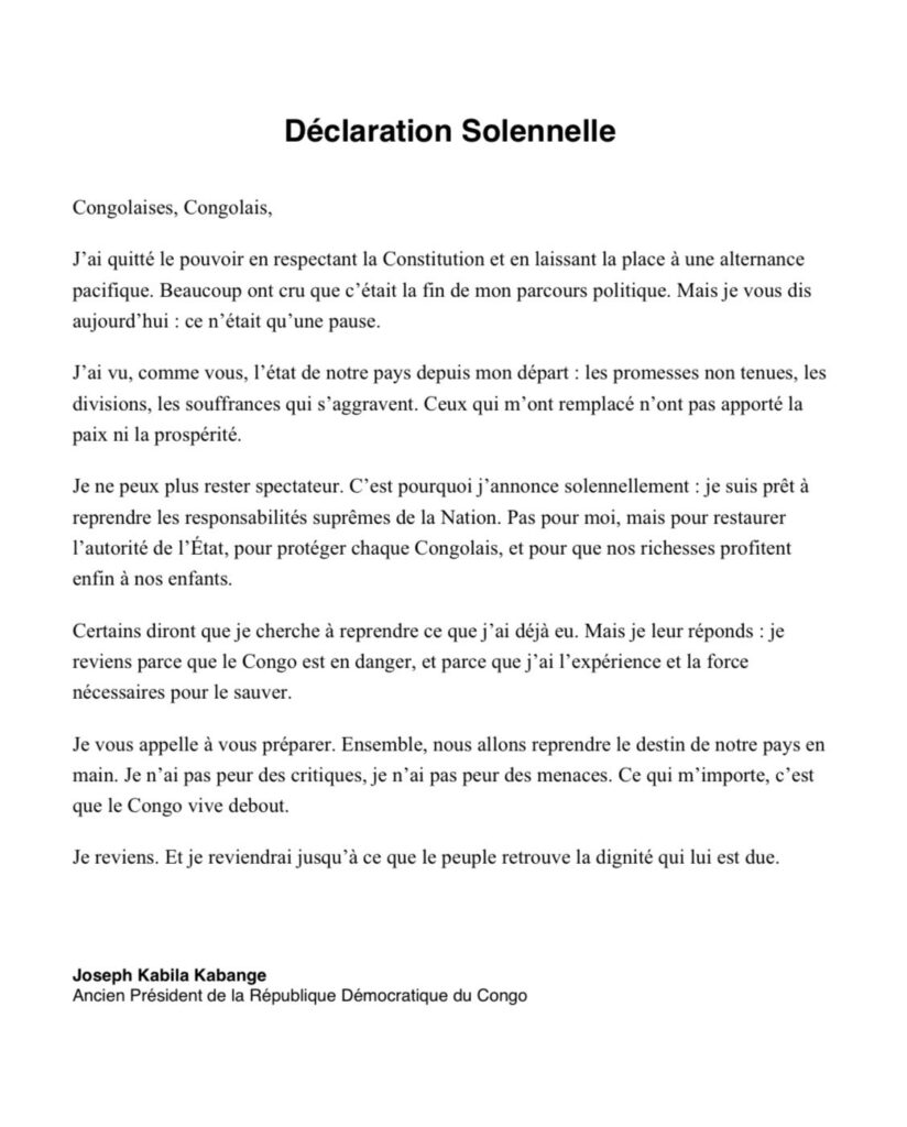 Mu nyandiko yanditse yagize ati” Banyekongo, Banyekongokazi,Naretse ubutegetsi nubahiriza Itegeko Nshinga kandi nemera ko habaho isimburana mu mahoro. Abenshi bibwiye ko byari iherezo ry’urugendo rwanjye rwa politiki. Ariko uyu munsi ndababwira nti: byari ikiruhuko gito. Nabonye, kimwe namwe, uko igihugu cyacu cyifashe kuva ntangiye kureka ubutegetsi; kubeshya ibyo bazakora ntibikorwe, amacakubiri, imibabaro irushaho gukomera.